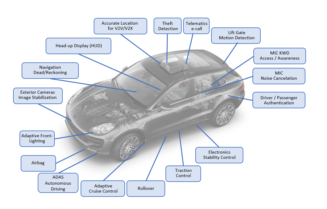 MEMS感測器,如同加速度計、陀螺儀及壓力感測器,相較其他類型感測器,較不受到下雪、下雨或無光源等環境變因影響。進入隧道或行經大樓林立區域一般感測器失效或失去GPS/GNSS訊號時,有前述進階感測器在手,就能確保車輛導航如常,不至迷路。陀螺儀決定行進方向、加速度計決定速度及行進距離,高度(於多層高速公路中走叉道時)則由壓力感測器決定。同時,指紋感測器、超音波停車感測器以及溫度感測器的應用,也在在讓駕駛及乘客享有更加便利、行駛安全及安全性的體驗。